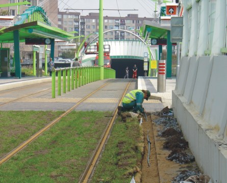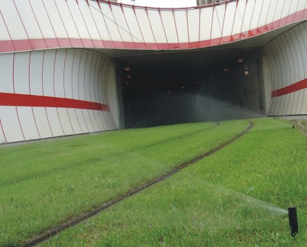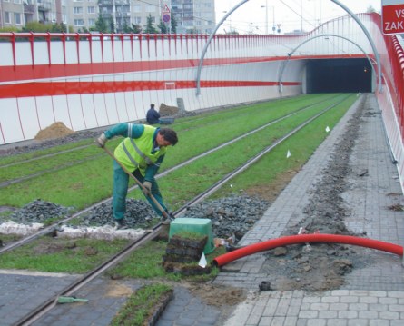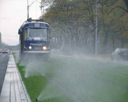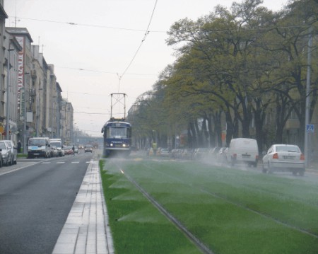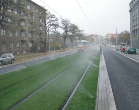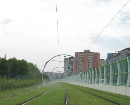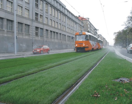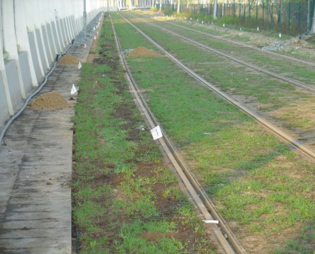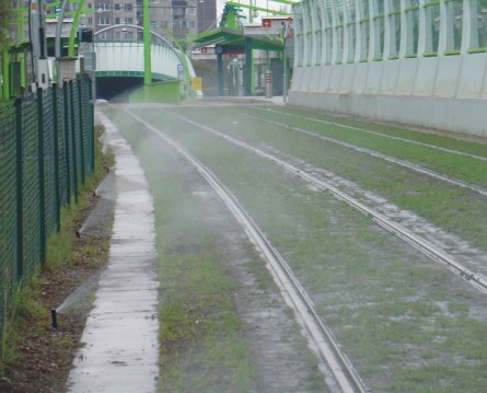 svěže zelená tráva v kolejišti - šedá,suchá v okolí |