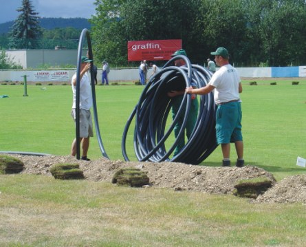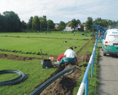 Krásně zelený, hustý trávník je skvělou vizitkou všech sportovních hřišť. Ať už fotbalových, golfových a mnohých jiných. Tráva a jiné povrchy, např. antukové jsou při sportech hodně namáhány a potřebují zvláštní péči a závlahu. Tu jim může poskytnout jen náš kvalitní a moderní, automatický zavlažovací systém. Každý zavlažovací postřikovač, který tvoří zavlažovací systém, obsahuje trysku, která se dá libovolně nasměrovat a regulovat. Můžete nasměrovat její délku i úhel postřiku. Zavlažovací systém na hřištích je propojen potrubím a spojkami, 50cm pod povrchem. A tak nevyčnívají a jsou schované před jakýmkoliv poškozením. Zavlažovací postřikovače jsou navrženy tak, aby vždy byla zavlažena celá plocha hřiště. A tak nemůže dojít k závlaze jen jednoho místa a celá travnatá plocha má dost vody. Neváhejte a nechte si naší firmou dodat automatický zavlažovací systém.