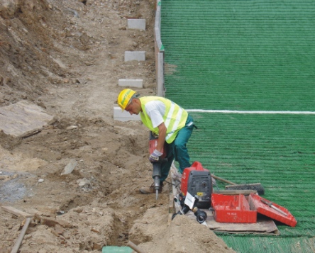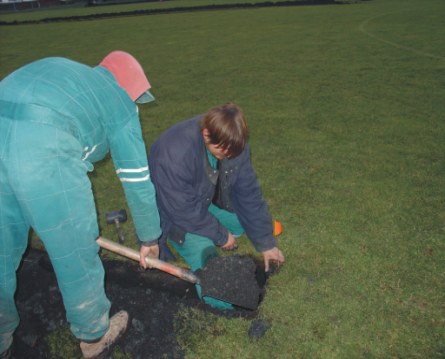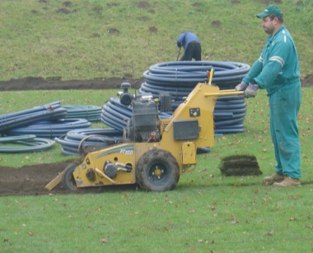 pracovník pečlivě upravuje podklad pro zpětné uložení drnu |