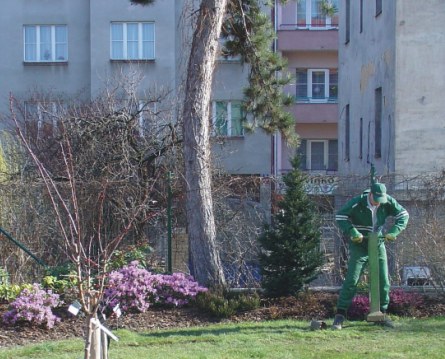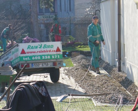 s hrabičkami dolaďuje po p. Václavovi okolí výkopu, před