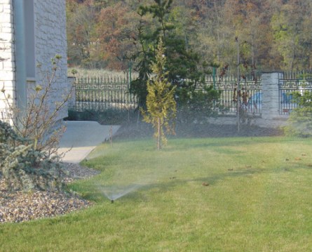 krásný rodinný domek a ještě úžasnější umístění postřikovačů u